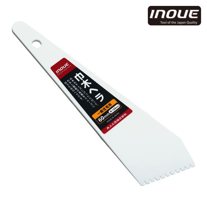 INOUE へら|特長:巾木のサイズにぴったり合って、巾木と壁面の接着をスムーズに行うためのヘラです。 プラスチック製で軽く、ギザ付でムラなく糊付けができ、きれいに仕上がるのが特徴です。