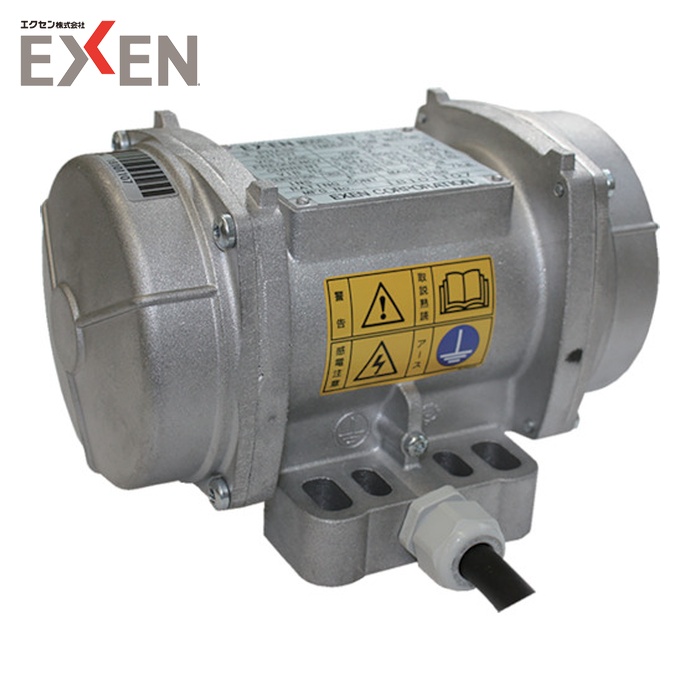 EXEN 振動モーター|特長:強力な振動を生かし粉粒体容器(ホッパーやタンク)内部の詰まりや付着を解消したり、充填設備機器など幅広く用いられています。 モーター内部にあるローター軸両端の偏心錘(ふりこ)が回転する事により強力な遠心力振動を発生します。 モーター固定子をモールド固定する事により、振動による巻線の断線リスクを低減しています。