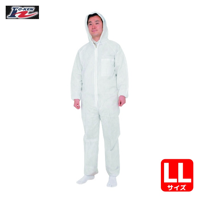 | 仕様・規格 | ● 色:ホワイト ● サイズ:LL ● 適合身長(cm):170-180 ● 股下(cm):73 ● 袖丈(cm):65 ● 胸囲(cm):120 ● 使い捨てタイプ ● 袖、裾、腰部ゴム入り ● フードひも入り ● 左胸、右尻に簡易ポケット付き |