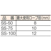 | 仕様・規格 | ● 基本使用荷重(t):0.75 ● 最大使用ロープ径(mm):12 ● 車数:1 ● 車径(mm):100 ● 寸法(mm)A:300 ● 寸法(mm)B:110 ● 寸法(mm)C:50 ● 頭部形状:フック型 ● 使用荷重(kg):750 ● ベケットなし ● スナッチ式 |