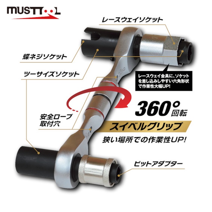 MUSTTOOL 配管用ラチェットレンチ|特長:独自設計の新型ソケットを採用し、1つのソケットで2サイズのボルトナットが回せます。 360°回転のスイベルグリップで狭い場所での作業性がUPします。 ギア数:72山で送り角は5度です。