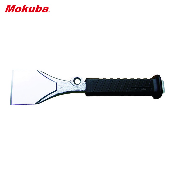 モクバ印 タガネ(チゼル)|特長:割る、はがす、削る、ハツルと多用途に使用できるタガネです。 高所作業に安全な落下防止の取り付け穴付です。 手への衝撃を緩和し、持ちやすいグリップ付きで、ハンマーを打ち損じた時でも、持ち手に当たりにくい形状です。
