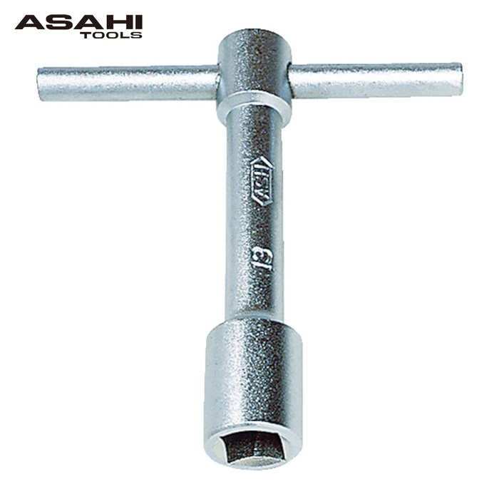 ASH T形レンチ|特長:早回しなど連続作業がしやすく、力の掛け具合を加減しやすい形状の便利工具です。 材質はS45Cで、表面処理はニッケルクロムメッキです。