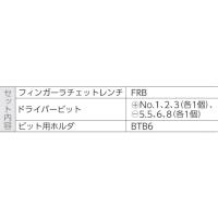・セット内容:フィンガーラチェットレンチ1個、ドライバービット[[+]]No.1、2、3(各1個)、[[-]]5.5、6、8(各1個)