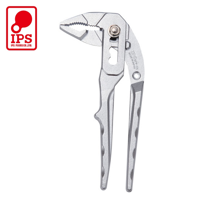 IPS ウォーターポンププライヤー|特長:水・油に滑りにくいウェーブハンドルです。 バネ解除機構で工具箱にもコンパクトに収納できます。 手のひらを挟みにくい安全ストッパー付です。
