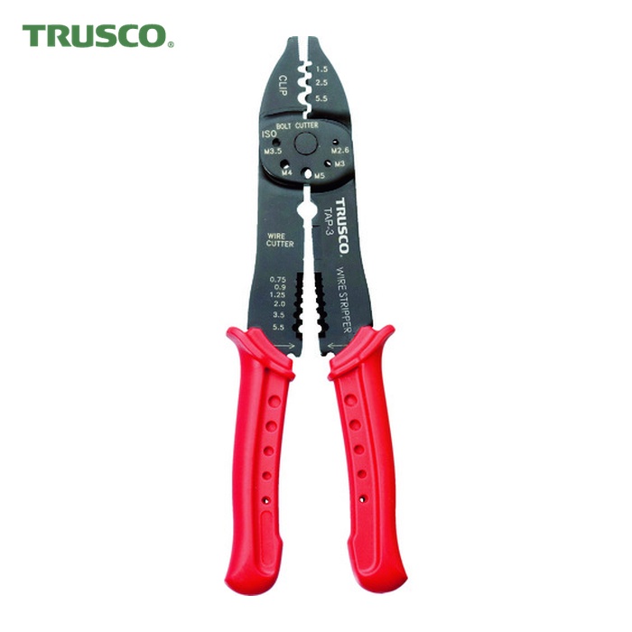 TRUSCO 手動圧着工具|特長:裸圧着端子・P。 Bスリーブ・イグニッションターミナルの圧着、ボルト・電線の切断、電線の被覆むきがこれ1本でできます。