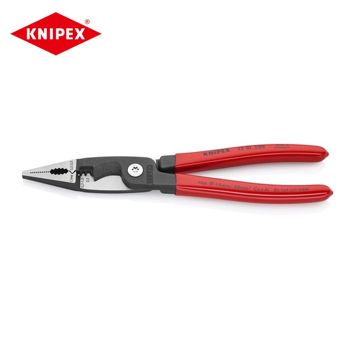 KNIPEX ノーズプライヤー|特長:電気工事用マルチファンクションプライヤーです。 1本で6つの機能が利用できます。 (つかみ、曲げ、バリ取り、切断、ストリップ、圧着)。