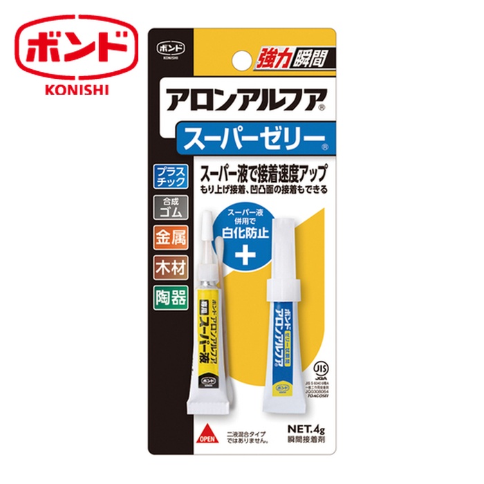 コニシ 瞬間接着剤|特長:セットのスーパー液との併用でハイスピード接着が可能です。 多少のすき間や凹凸面にも使えます。 タレないので天面・曲面にも使えます。