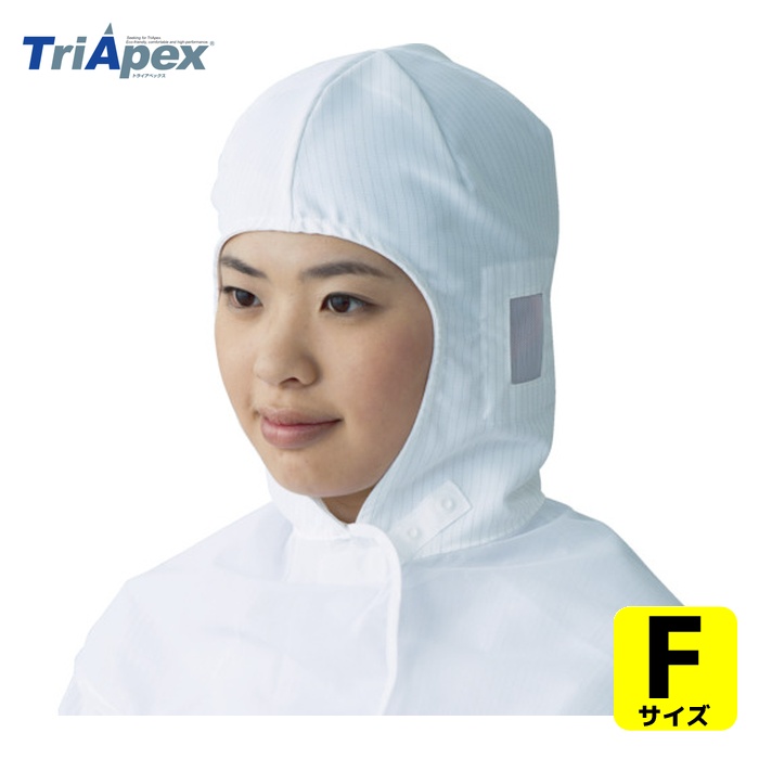 TriApex クリーンルーム用フード|特長:省エネ・節電対策によるクリーンルームの室温上昇に対応しています。 吸汗速乾性に優れた素材を使用しています。 タレ部分には通気性に優れたメッシュ素材を使用しています。