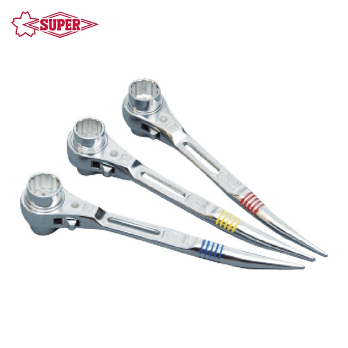 スーパー 両口ラチェットレンチ|特長:正逆は切り替え爪式です。 仮設足場・住宅施工等に最適なショートタイプです。 軽量・コンパクトでより使いやすくなっています。
