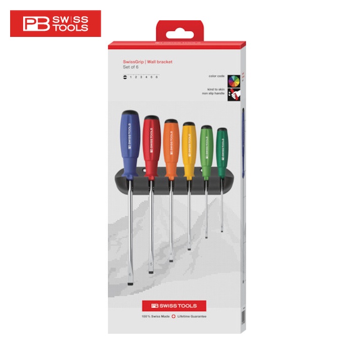 PBスイスツールズ 樹脂柄ドライバー|特長:スイスグリップはポリプロピレン・サントプレンの2種の新素材からなるハンドルです。 サイズによってハンドルのカラーを変えているため、判別が容易です。 壁掛け収納用ホルダー付きです。