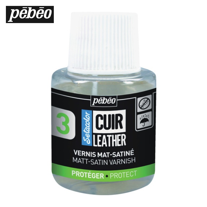 Pebeo 多目的塗料|特長:トップコート剤です。 マット・サテン仕上げです。 革や合皮の上にペイントした箇所の引っかき傷、擦り傷、一般的な損耗を防ぐことができます。