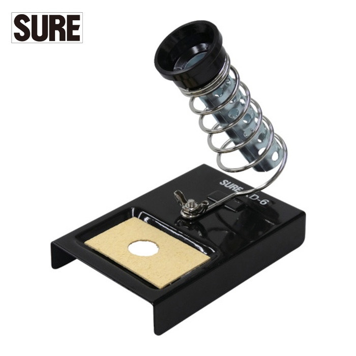 SURE コテ台|特長:小型はんだこて用のスタンドです。 外径が20mm以下のこて先のはんだこてに対応します。 清掃用スポンジ付きです。