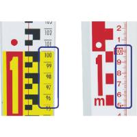 シンワ アルミスタッフ|特長:表面は10mmごとに読み取りやすい目盛線になっており、50mm毎に赤い目盛線になっています。 表面は1mごとに本体の色が黄・白の交互になっており、遠くから見てもすぐに何mなのか分かりやすくなっています。 裏面は基準から1mmピッチの目盛を採用し、外構などの測定にも便利です。