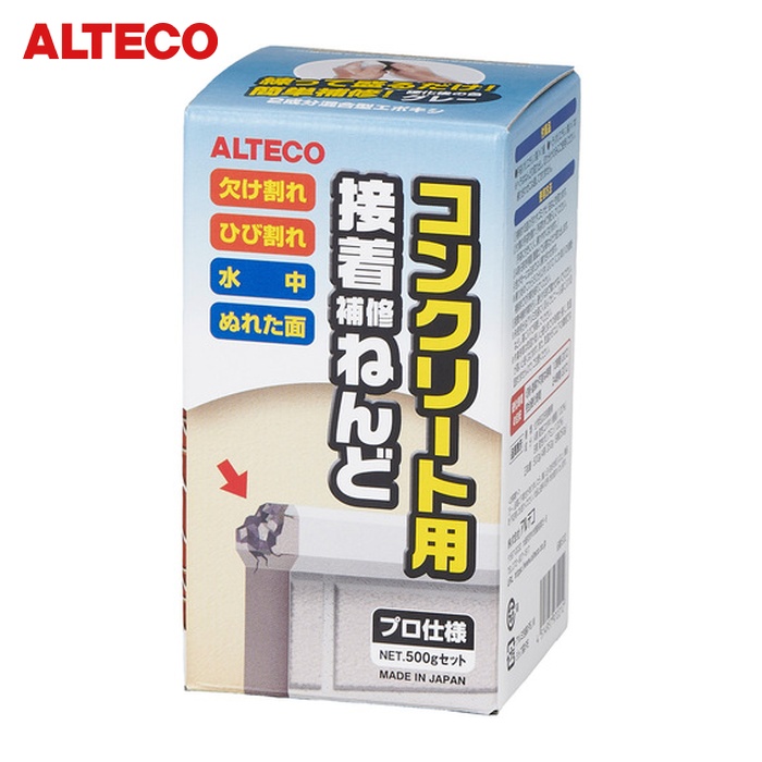 アルテコ コンクリート用補修剤|特長:水中・湿潤面でも硬化する混合比1:1のエポキシねんどです。 補修後、水性・油性各種塗料での塗装も可能です。 コンクリ以外にも金属配管やタイル等にも使用可能です。