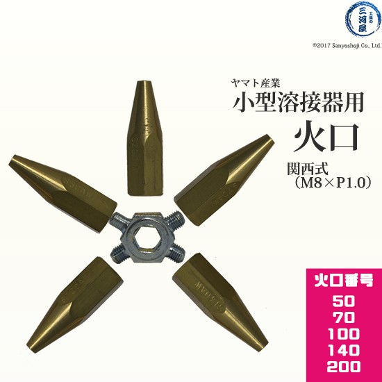 小型溶接器など一般的な溶接器は、関西式(M8×P1.0)、関東式(M7.5×P0.9)と火口の取付ネジが異なります。こちらの商品は関西式のため火口の取付ネジがM8×P1.0になります。(関東・関西式の他、各メーカー毎に火口のネジピッチは異なります)