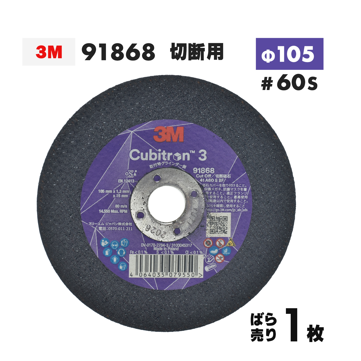 3M(スリーエム)の切断砥石 Cubitron3 91868 105x1.3x15 #60S ばら売り 1枚です。