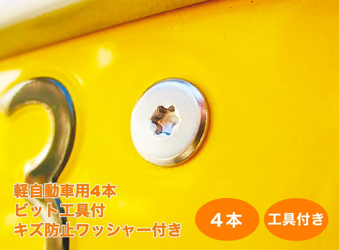 ビット工具、キズ防止ワッシャー付 盗難防止ネジ 4本セット ステンレス トルクス スリムヘッド ボルト 低頭 フラット ナンバープレートねじ交換用 軽自動車