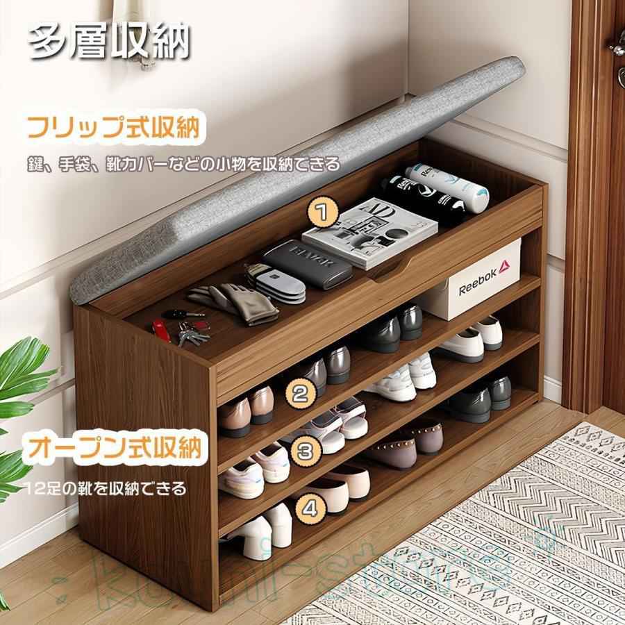 【大容量の収納スペース】3段式の玄関ベンチは十二足の靴を置くことができて、日常の靴を履くニーズを満たすことができます。それ以外にも、フラップ式の隠し収納があり、鍵、財布、靴カバー、手袋などの小物を収納できます。