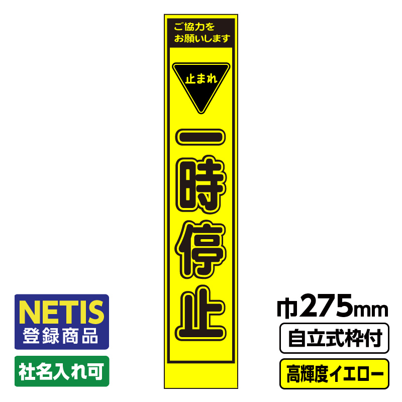 Netis登録商品 工事看板 スリム「一時停止」 プリズム高輝度反射 イエロー 黄色 蛍光緑 自立式19角枠付