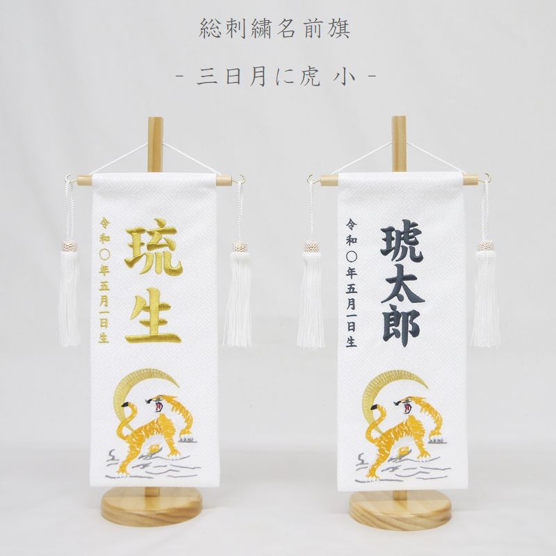 【三日月に虎 - 小 -】 名前旗 白 小 男の子 総刺繍 命名旗 名入れ 五月人形 小サイズ 端午の節句 こどもの日 室内飾り 送料無料 SO-164