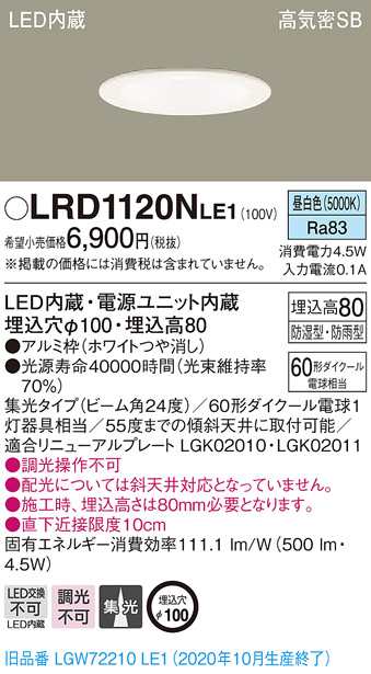 【法人様限定】パナソニック LRD1120NLE1 LED屋外用ダウンライト 埋込穴φ100 昼白色 浅型8H・高気密SB形・集光