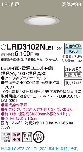 【法人様限定】パナソニック LRD3102NLE1 LED屋外用ダウンライト 埋込穴φ100 昼白色 浅型8H・高気密SB形・拡散