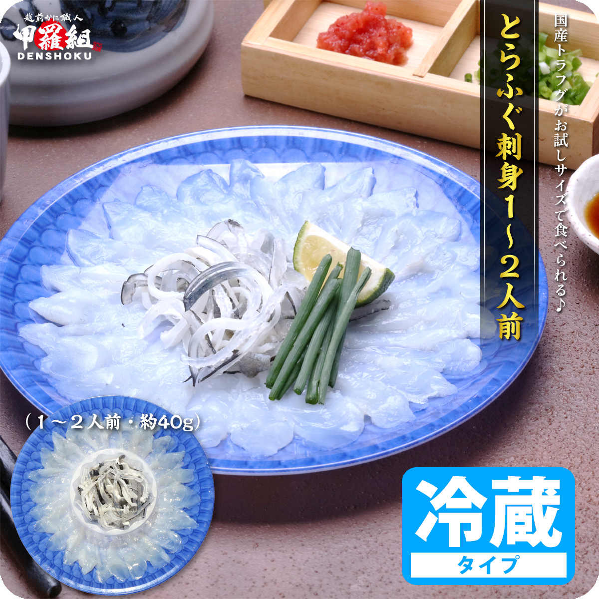 高級食材トラフグのお刺身がご自宅で簡単に食べられるセットをご用意いたしました。ご注文を受けてからフグを捌き冷蔵便でお届けいたします。福井県・若狭湾産のトラフグはプリプリと弾力のある歯ごたえと旨味が強いのが特徴です。40gと少量ですが、その分リーズナブルでちょっとしたお祝いや晩酌などに活躍すること間違いなし!この機会にぜひお買い求めください。