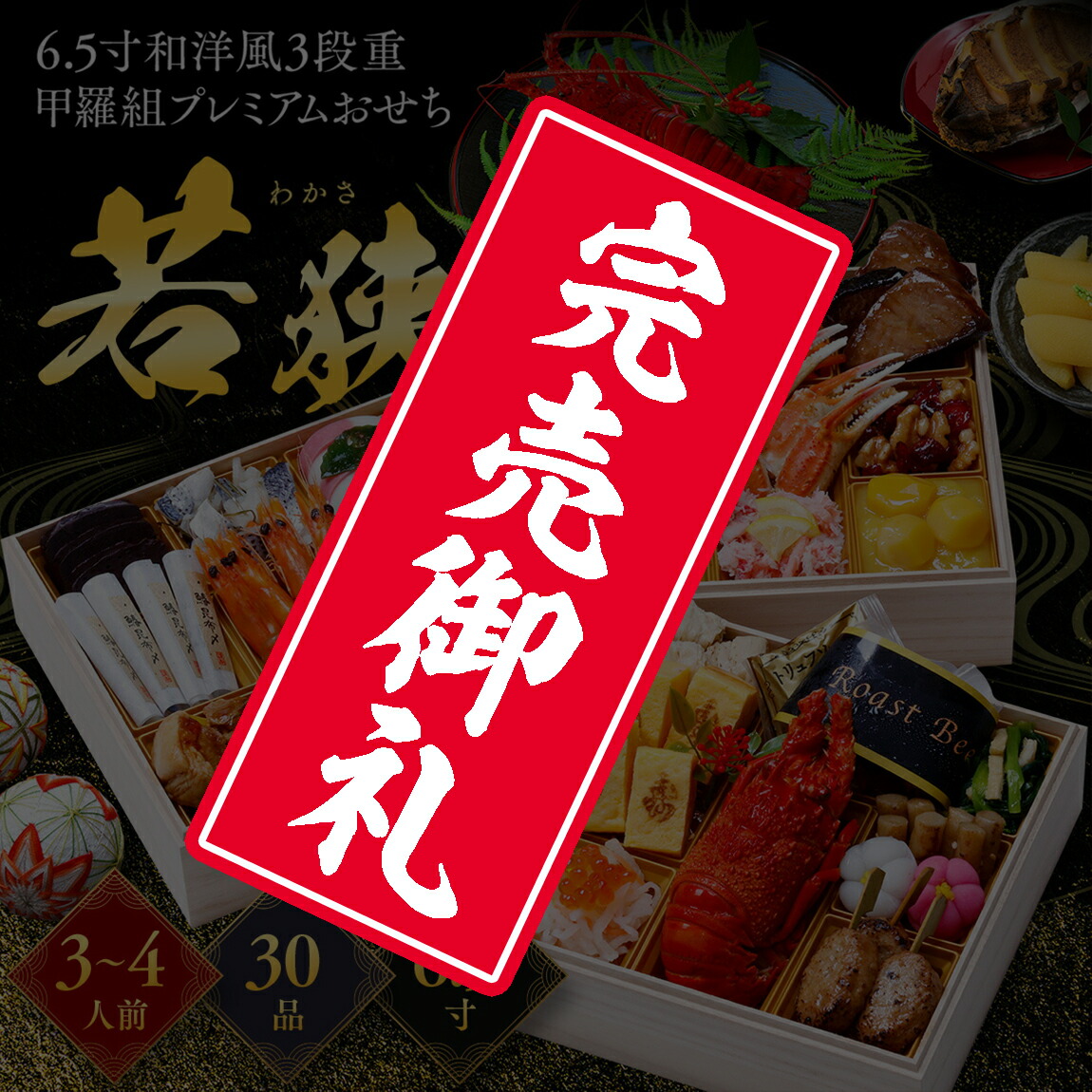 ワンランク上の高級おせち!本格的なおせちを6.5寸(20cm)×3段でお届け!華やかな彩りを兼ね備えた御祝の席にふさわしい逸品!また3段合計で30品目の品数で、お子様からご年配の方までご満足いただける内容となっております。