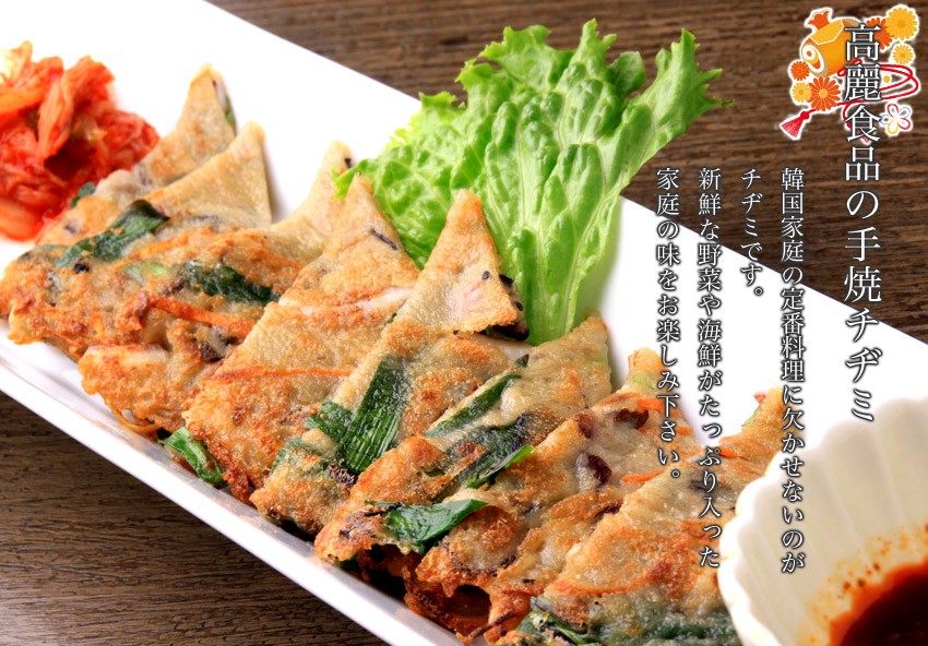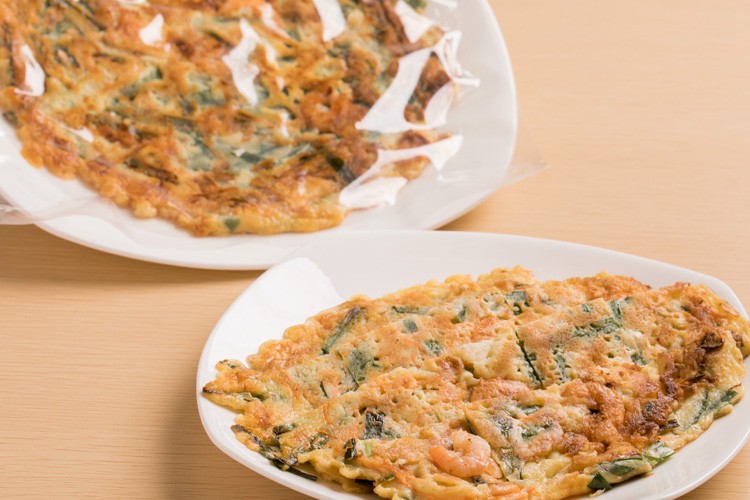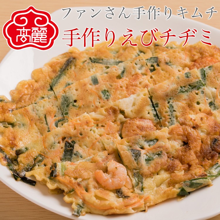 エビチヂミ【1枚】1枚1枚を丁寧に焼き上げた韓国のお好み焼きであるチヂミです。香ばしい海老が入っており、そのままでもポン酢を付けてでも美味しくお召し上がりいただけます。