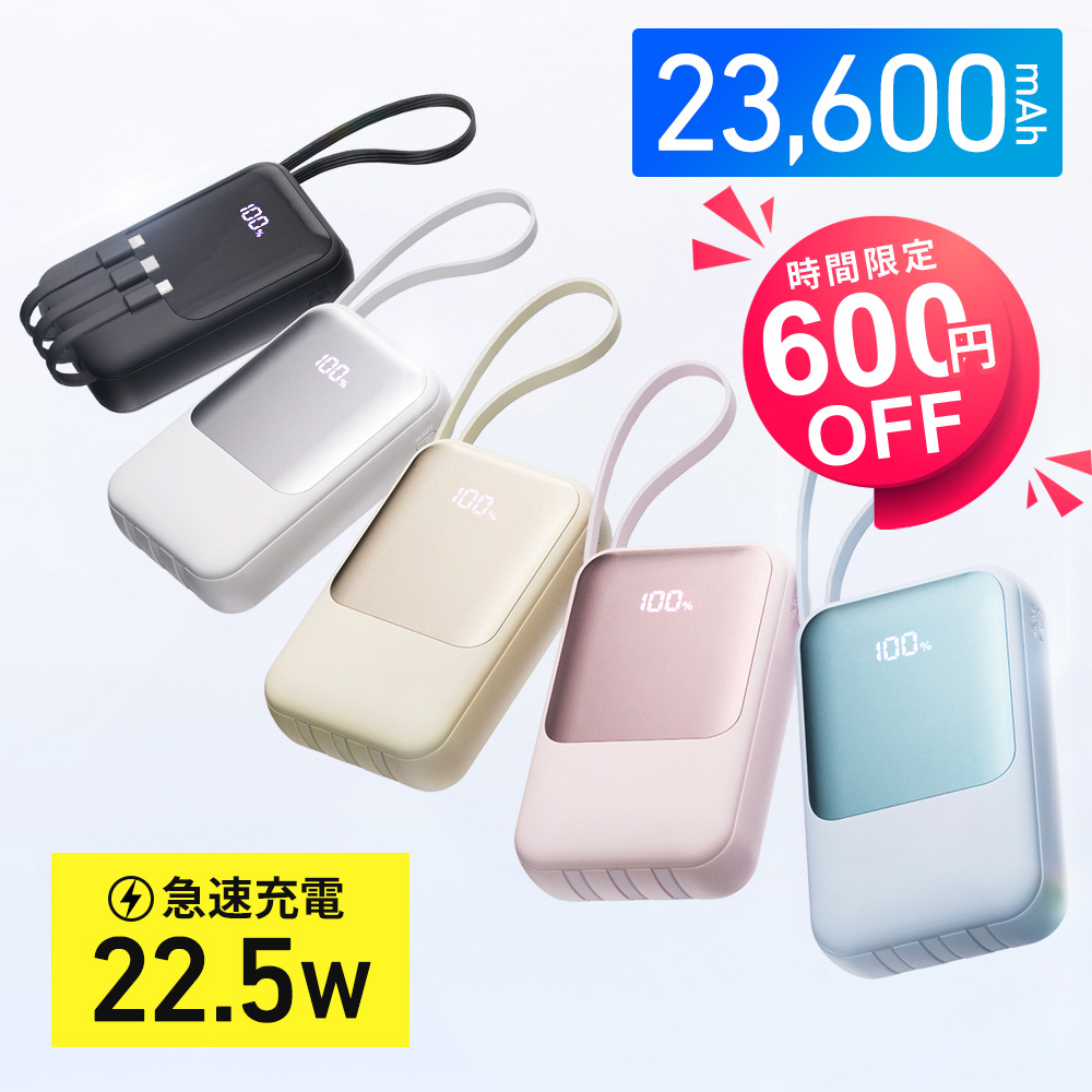 モバイルバッテリー 大容量 23600mAh PD22.5W 急速充電 Type-C出入力 4本ケーブル内蔵 軽量タイプc対応 残量表示 LEDライト 便利グッズ 旅行 出張 停電対策