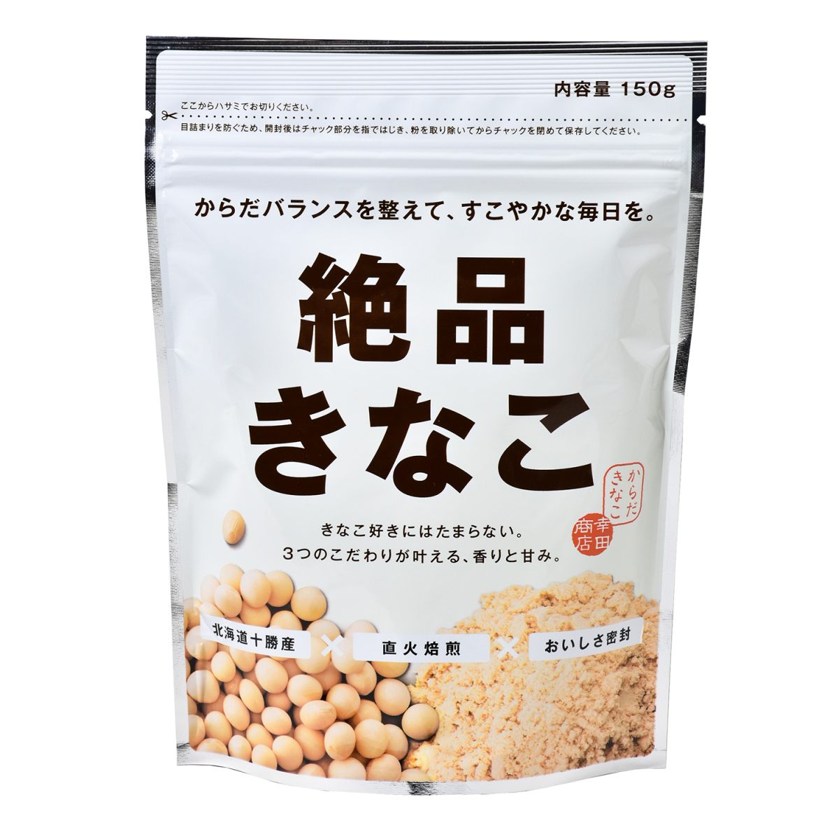 きな粉好きにたまらない。3つのこだわりが叶える、香りと甘み。 「北海道十勝産」×「直火焙煎」×「おいしさ密封」 |