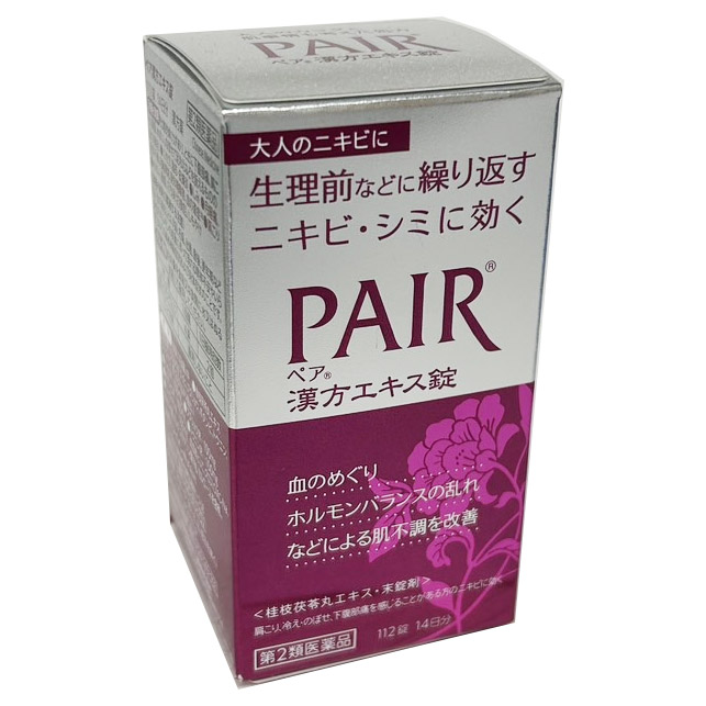 「ペア漢方エキス錠」は,5種の生薬からなる漢方「桂枝茯苓丸」のチカラで血のめぐりを改善。ホルモンバランスの乱れなどによるニキビ・シミをカラダの内側から治す漢方薬です。