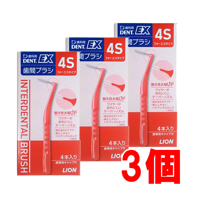 | 【商品の情報】 | | 製品名 | DENT.EX 歯間ブラシ 4S | | 製品特長 | 高い耐久性と操作性の歯間ブラシ 超合金SAワイヤー採用で折れにくく、110℃アングルと85mmホルダーが高い操作性を確保、確実なプラークコントロールを実現します。SSSからLLまで6サイズの豊富なラインナップであらゆる歯間に対応します。| 使用方法 | ・ゆっくり歯間に挿入し、ブラシを細かく前後に動かしてください。 ・歯の内側からも挿入し、プラークを除去しましょう。 ・使用後はすすぎ洗いし、乾燥させてください。 | | 規格 | 4S 4本入(携帯用キャップ付) | | 製造販売者 | ライオン株式会社 03-3621-6611 | | 販売者 | ライオン歯科材株式会社 03-3621-6183 | |