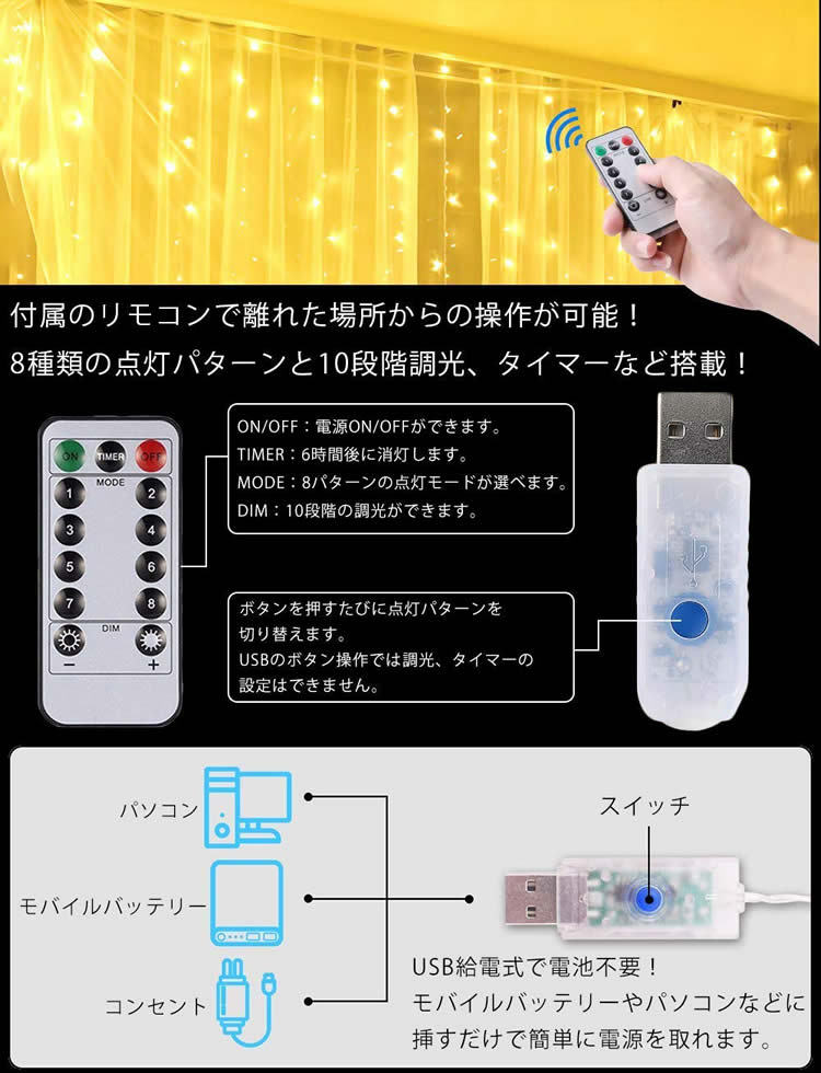 7種類の点灯パターンと10段階調光、タイマーなど搭載!