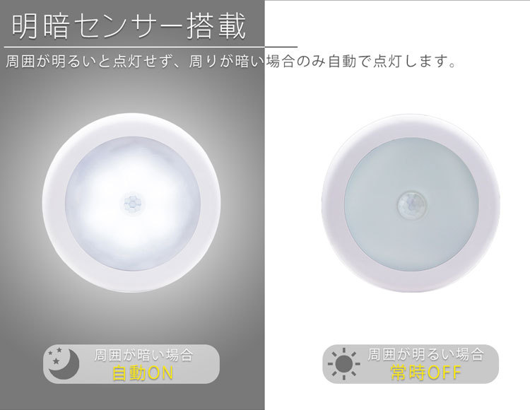 明暗センサーを搭載しており、明るい場所では点灯せず、周囲が暗い場合のみ反応し自動で点灯します。