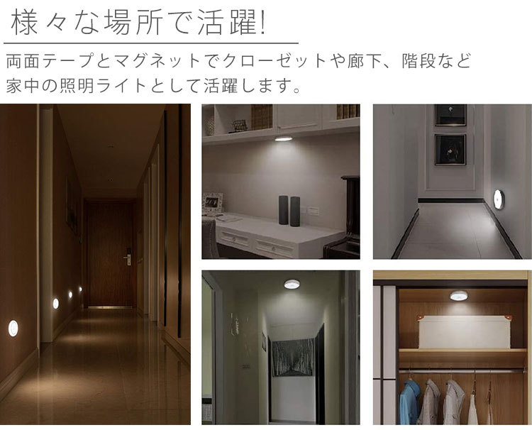 両面テープとマグネットでクローゼットや廊下、階段など家中の照明ライトとして活躍します。