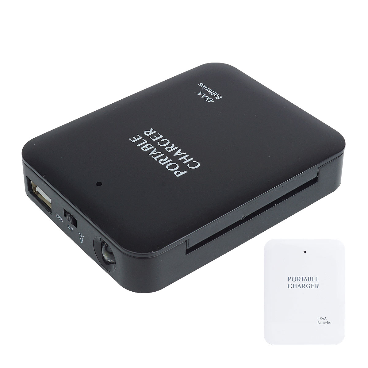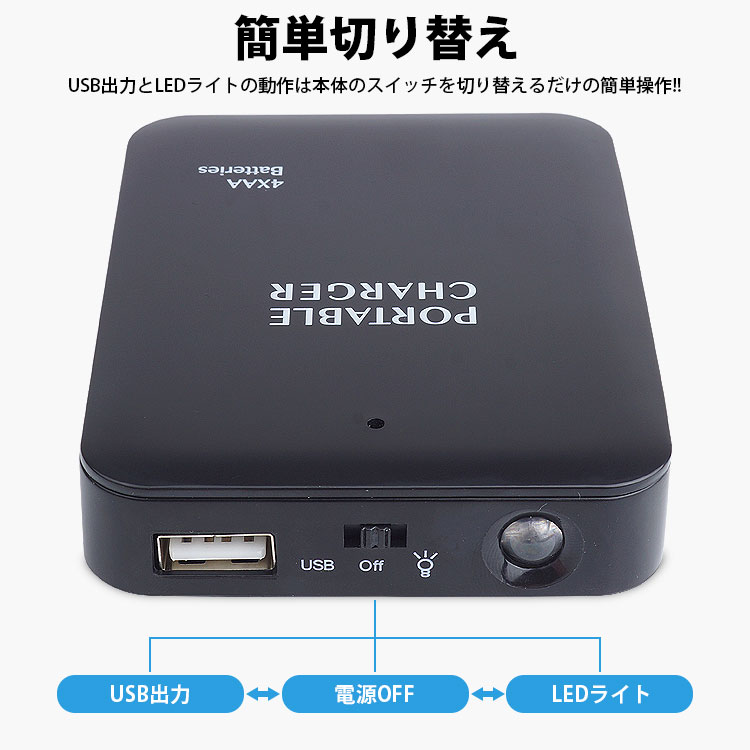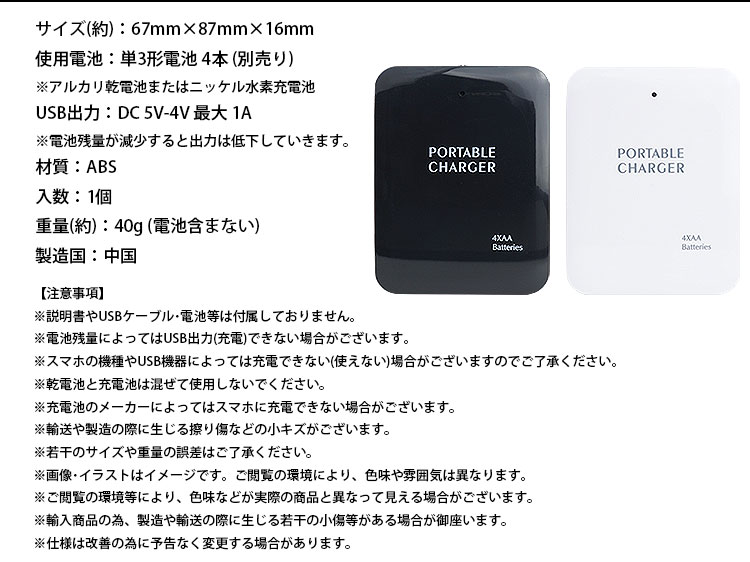 単三電池×4本でスマートフォン等を充電することができる電池式モバイルバッテリー