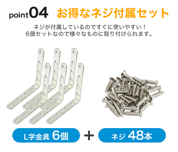 L字金具6個とネジ48本セットですぐにご使用いただけます。