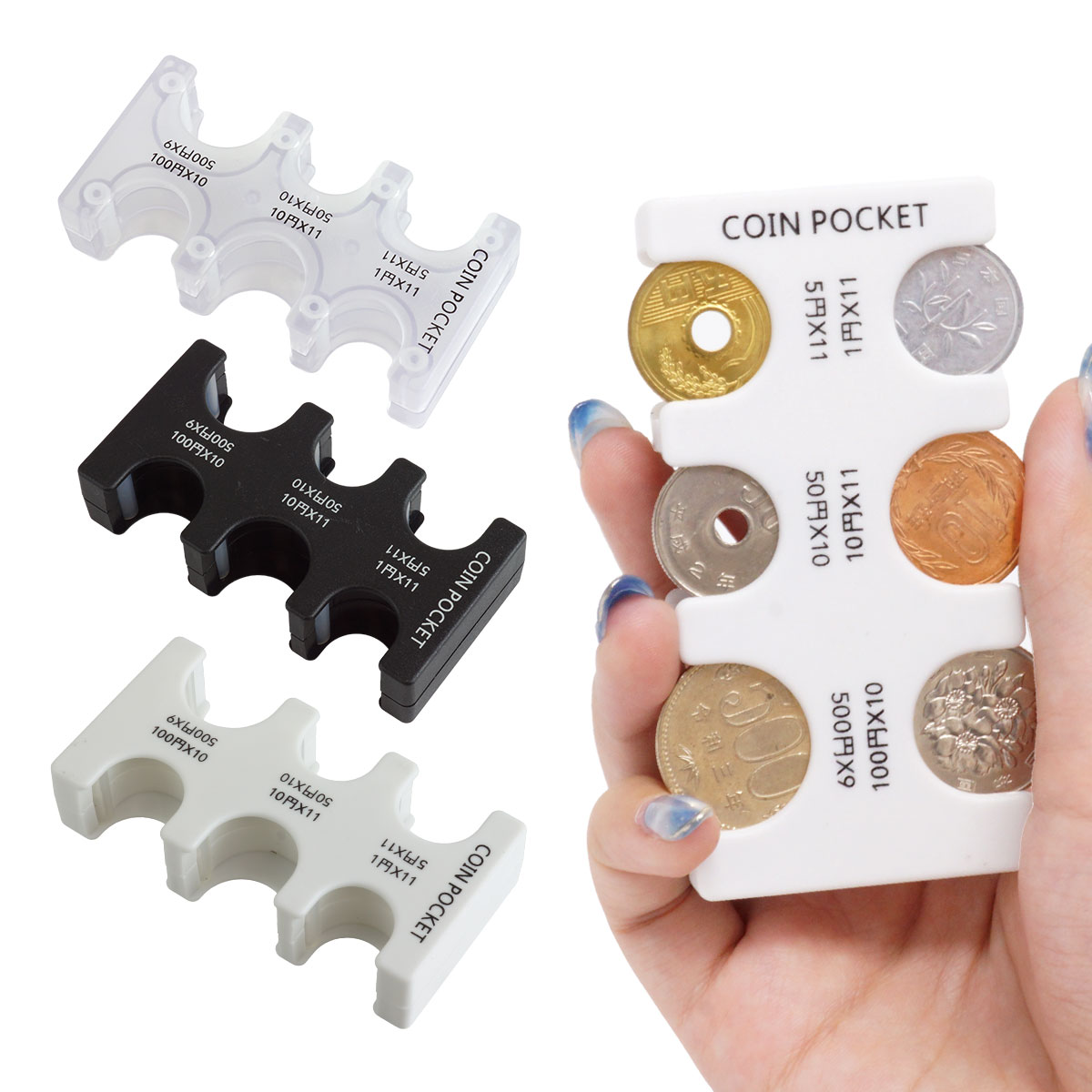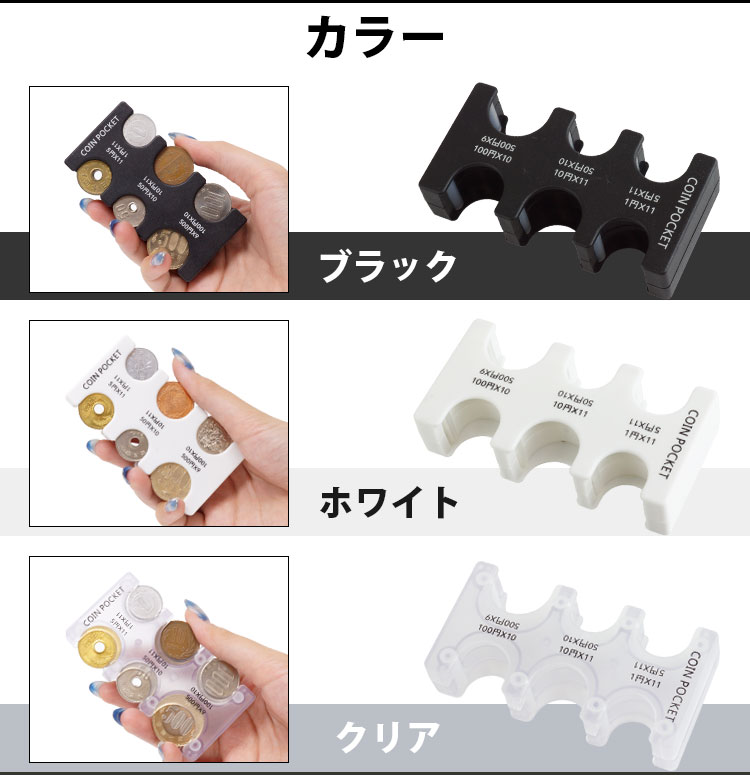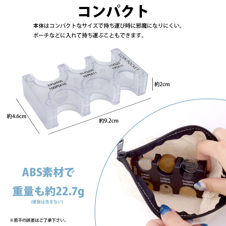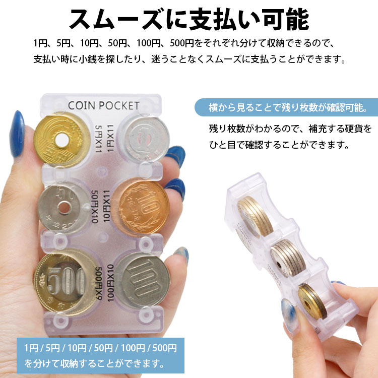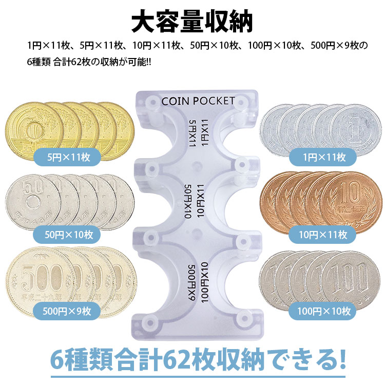 収納可能数:1円×11枚、5円×11枚、10円×11枚、50円×10枚、100円×10枚、500円×9枚