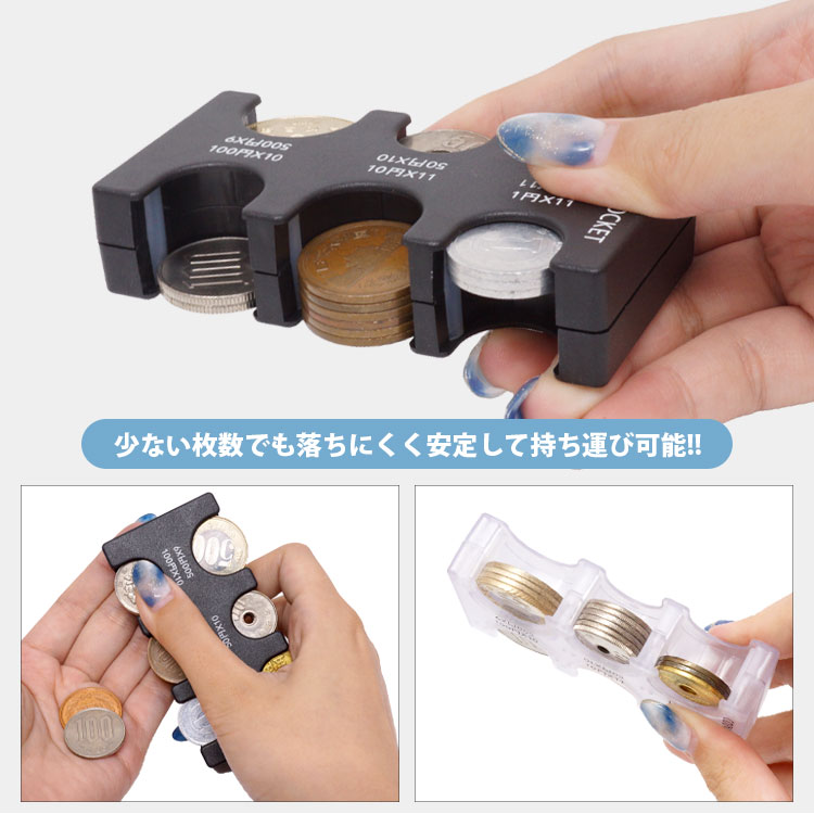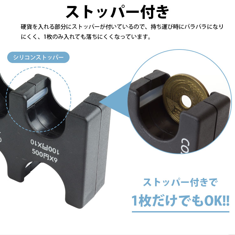 硬貨を入れる部分にストッパーが付いているので、持ち運び時にバラバラになりにくく、1枚のみ入れても落ちにくくなっています。
