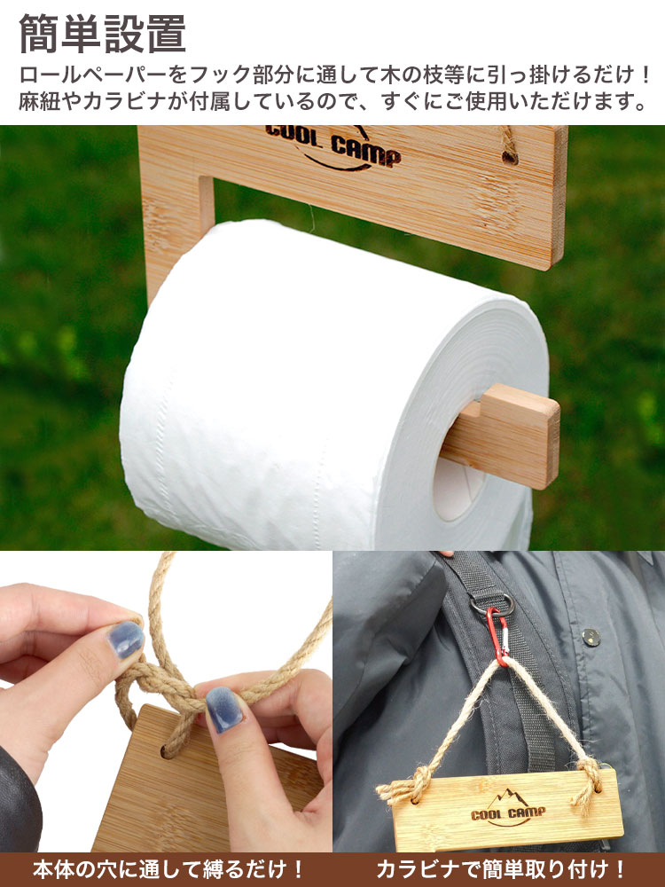 ロールペーパーをフック部分に通して木の枝などに引っ掛けるだけの簡単設置!