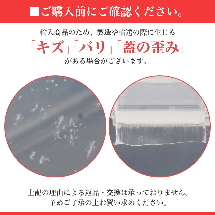 ※輸入商品のため、製造や輸送の際に生じる「キズ」「バリ」「蓋の歪み」がある場合がございます。