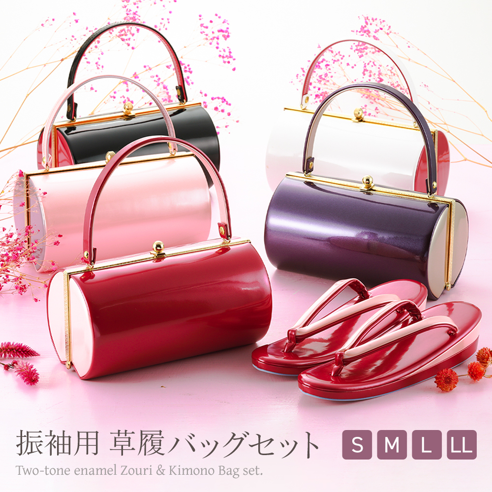 振袖用 草履バッグセット エナメル生地 シンプル ツートンカラー ハンドバッグ 二枚芯ぞうり 成人式 卒業式 S〜LLサイズ 全5色 bs-371