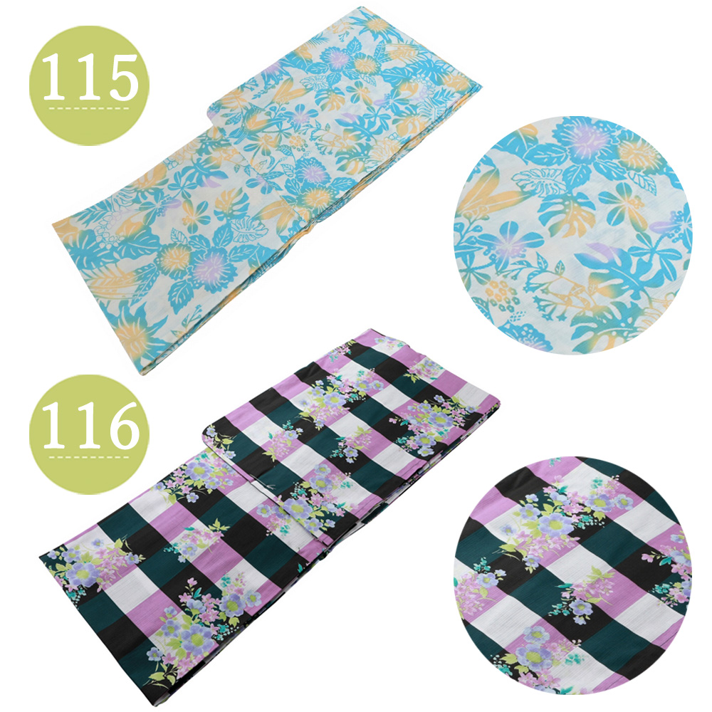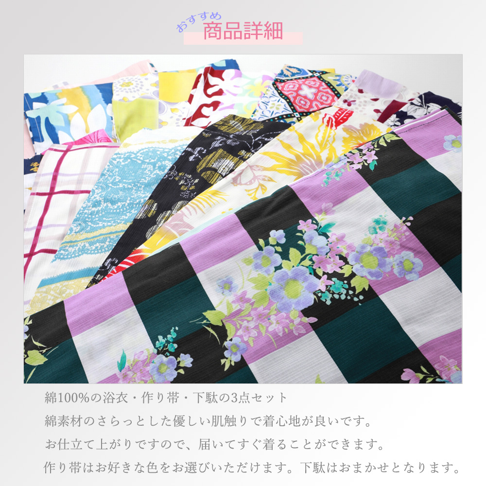女性用 浴衣 お仕立て上がり 作り帯 下駄 3点セット 綿100% フリーサイズ 全19柄 ta-334(帯288)