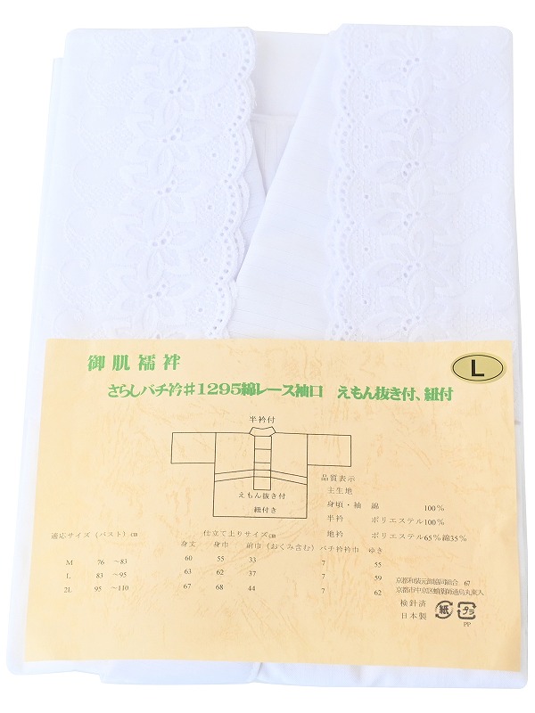 日本製 きものスリップ 和装肌着 肌襦袢 さらしバチ衿 レース袖 えもん抜き 紐付き 絽 Lサイズ hs-143
