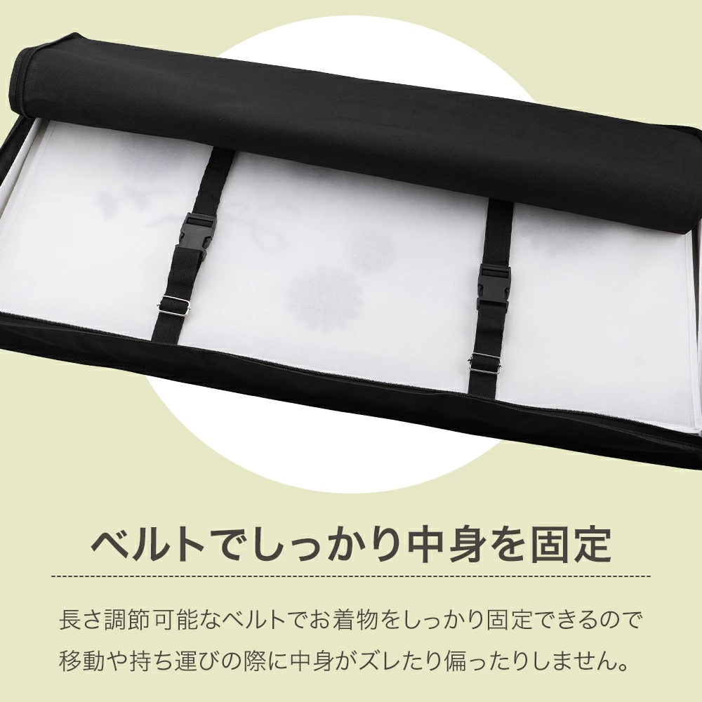 中には長さ調節可能なベルトがついていますので、移動や持ち運びの際にも中の着物がズレたり偏ったりすることがありません。