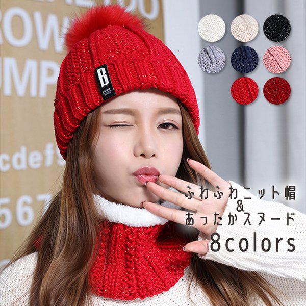 ニット帽 レディース スヌード 2点セット 秋冬 ポンポン ファー ふわふわ もこもこ 女の子 ネックウォーマー スキー スノーボード ふんわり 無地 ゆったり 爆買