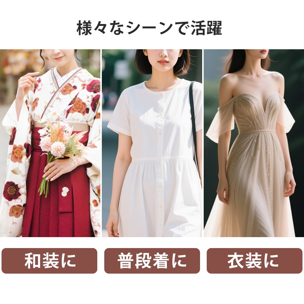 ワンピースなど普段着にはもちろん、着物や袴などにも。