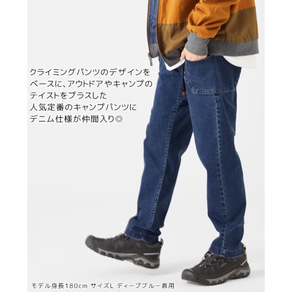 | 《KRIFF MAYER人気アイテム『キャンプパンツ』(品番:1844007)のデニム仕様が新登場!》 クライミングパンツのデザインをベースに、アウトドアやキャンプのテイストをプラスしたキャンプパンツ。 一番の特徴はサイドのビッグツールポケット。 キャンプで使うツールや小物の収納をイメージしました。 ウエストは付属のウェビングベルト+内蔵ゴムによりイージーな穿き心地に。 伸縮性に優れたストレッチデニム生地、180度開脚できる程の可動域を持つガゼットクロッチが抜群の動きやすさを発揮します。 足元スッキリなテーパードシルエット。 ベルトループも付いているので、好みのカラビナやチョークバッグなども取り付けられます。 ※インディゴ染めの染料は色落ちしやすい性質を持ちます。 着用・洗濯を繰り返すことにより、少しずつ変化する表情や風合いを楽しむことができます。 その為摩擦や濡れたままでの放置により移染する場合がございます。 取り扱いの際は付属のコーションタグをよくご確認くださいませ。 | |||||||||||||||||||||||||||||||||||||||||||||||||||